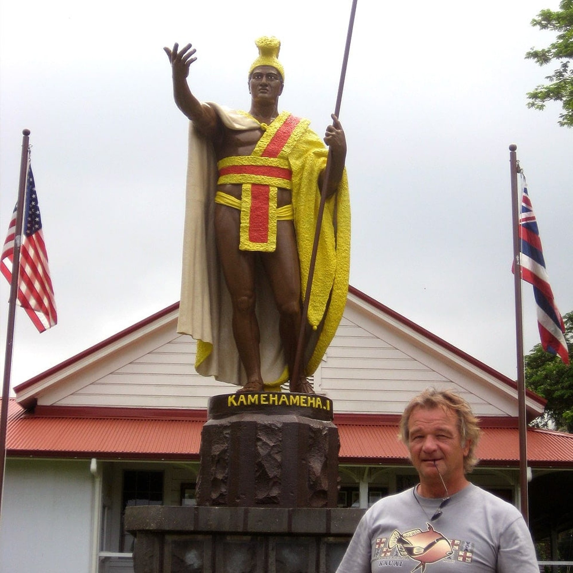 Aber wenige Meilen weiter und wir finden unser grünes Paradies wieder. Auf unserer Tour nach Kapaau sind wir über einen Pass gefahren und es ist ein wenig frisch geworden. In alter Gewohnheit hatten wir das Dach von unserem Jeep offen und sind in einen ungemütlichen kalten Nebel geraten. Aber nachdem die Straße wieder bergab führte, konnten wir die Heizung wieder ausschalten und die „Gänsehautentzündung“ ließ wieder nach. In Kapaau steht die originale Statue des Königs Kamehameha. Er war der erste König von Hawai’i (1795 – 1819) und ihm folgten eine ganze Reihe weiterer Könige immer mit demselben Namen. Ihm zu Ehren sollte 1878 in Honolulu eine Statue aufgestellt werden. Sie wurde in Frankreich angefertigt und auf der Fahrt zu den hawai’ianischen Inseln fing das Schiff leider Feuer und ging mit der Statue unter. Schnell wurde eine Ersatzstatue angefertigt und diese steht heute noch in Honolulu im historischen Stadtteil. Die originale Statue wurde Jahre später von einem Kapitän namens Jarvis aus dem Meer geborgen. Sie war in einem jämmerlichen Zustand und in Honolulu entschied man, dass diese Statue an den Geburtsort von Kamehameha gebracht werden sollte. Dort wurde sie restauriert und erst einmal braun angestrichen. Nach Jahren der Restaurierung und mittlerweile 23 Übermalungen strahlt sie jetzt wieder in ihren originalen Farben.