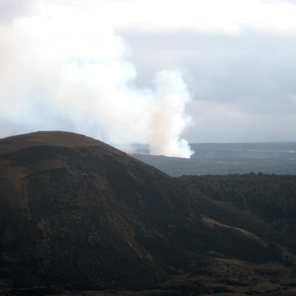 Auf der östlichen Seite angekommen fährt man immer an der Küste entlang bis zum Gebiet des Mauna Loa. Mauna heißt hier wieder Berg und Loa bedeutet „lang“. Der Berg ist tatsächlich mit 4.170 m nicht ganz so hoch wie der Mauna Kea aber seine Fläche bedeckt durch seine unglaubliche Länge einen Großteil der Insel. Vor dem Mauna Loa gibt es deinen ausgekühlten Krater. In diesen kann man runtersteigen und durchwandern. Wie gesagt durch den „kleinen“ kann man wandern… Im Hintergrund dampft, qualmt und zischt der Kilauea noch gewaltig.