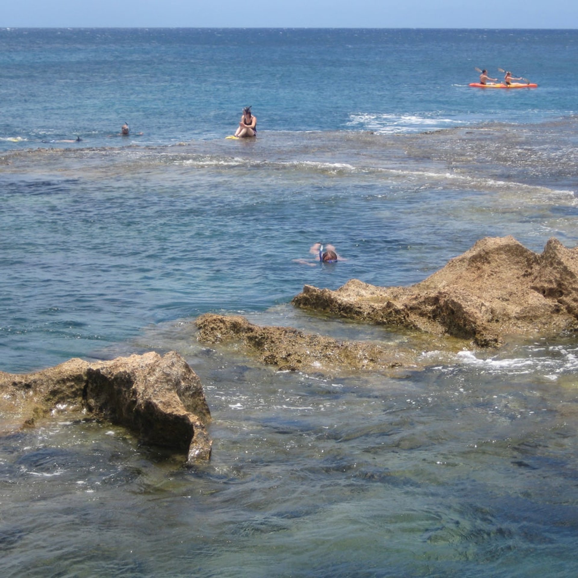 Nachdem am Morgen jemand das Meer vor unserer Tür geklaut hatte, hielt uns dann auch nix mehr dort. Die letzte Nacht wollten wir wieder in Honolulu verbringen. Und auf dem Weg dorthin haben wir an der Sharks Cove (Hai Bucht) nochmals einen Schnorchel Stopp eingelegt. Hier hat man mir erzählt, dass sich schon mal der ein oder andere Hai in die Bucht verirrt. Solange man ihn in Ruhe lässt, lässt er einen auch in Ruhe. Es sei denn...... ja es sei denn man hat zufälligerweise einen toten Fisch auf dem Rücken. Dann wäre man schon ein wenig interessant für den Hai. Also beim Schnorcheln immer mal über den Rücken gewedelt... aber da war glücklicherweise nix.