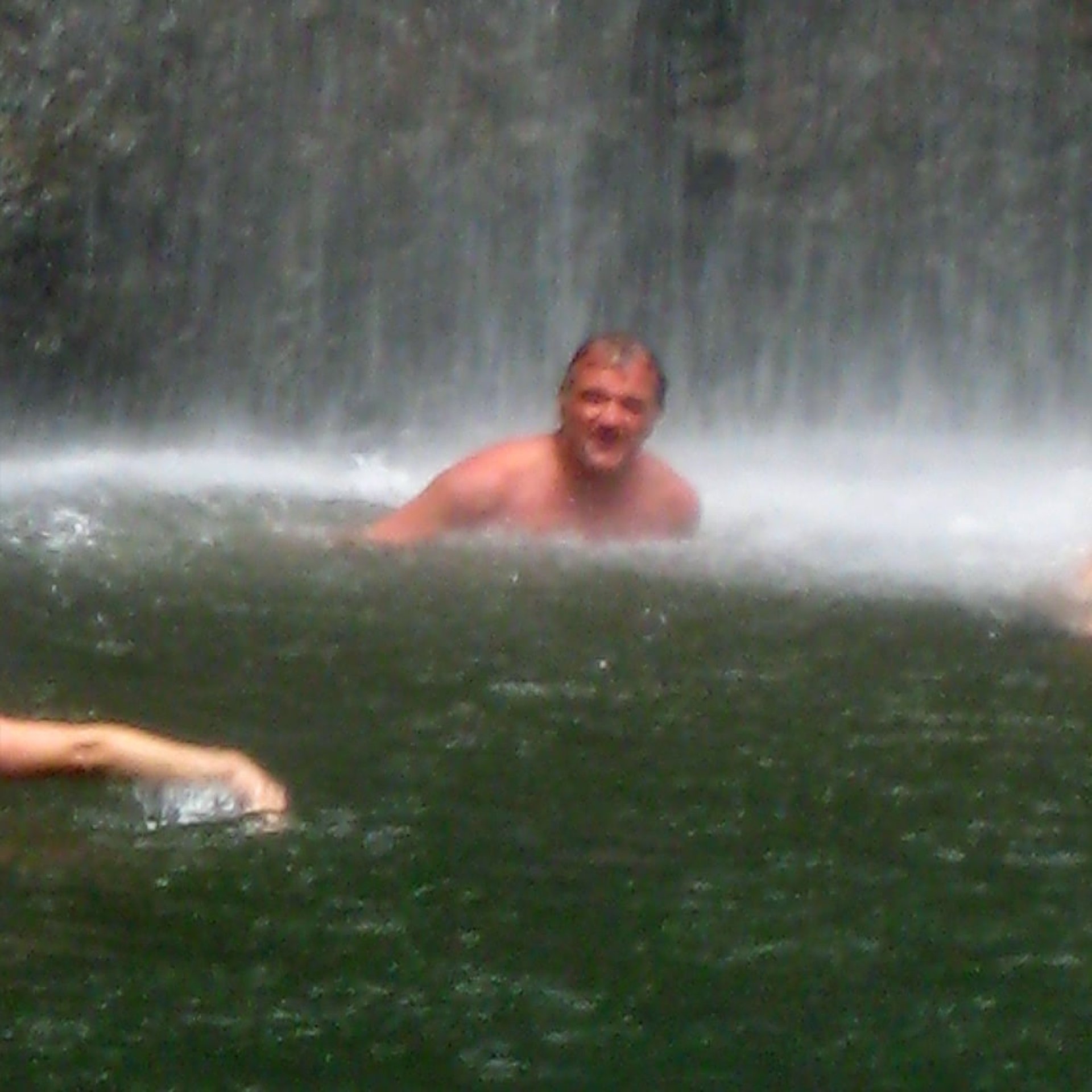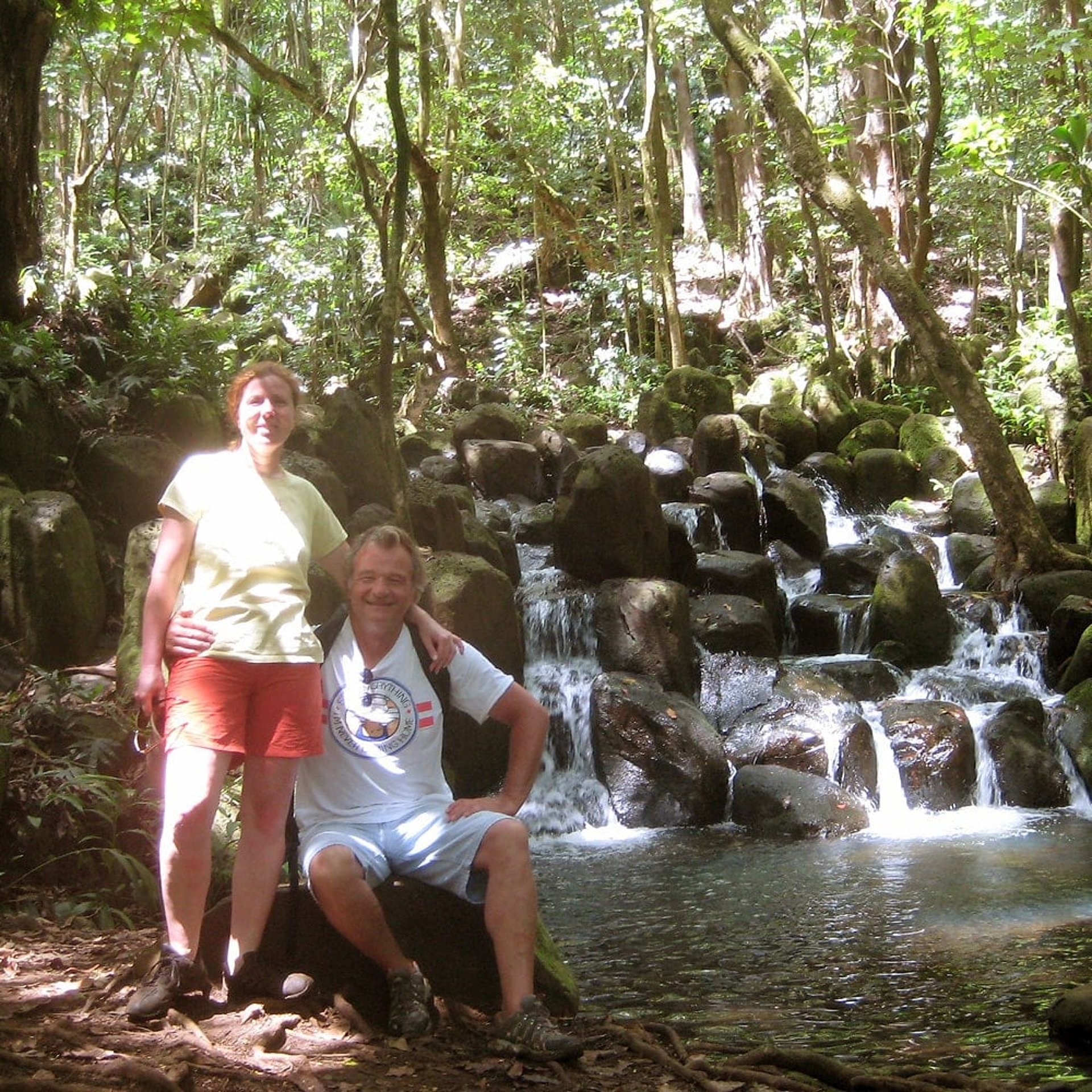 Aber was solls… Am Wasserfall angekommen ist Tilo sowieso erst einmal in das kalte Wasser gesprungen. Mir war es definitiv zu kalt – trotz der Schwüle – und nass war ich ja sowieso schon. Witzigerweise liefen an dem Wasserfall auch wieder zahllose Hähne und Hühner rum. Ich habe unseren Guide Nathan mal gefragt, wo die denn alle herkommen. Er hat mir erklärt, dass die Portugiesen wohl die Hühner auf Hawaii eingeführt haben. Als es 1992 zu dem Wirbelsturm Iniki auf Kauai kam sind sämtliche Hühnerfarmen zerstört worden und die Hühner waren frei. Seitdem vermehren sie sich unkontrolliert und niemand unternimmt etwas dagegen.