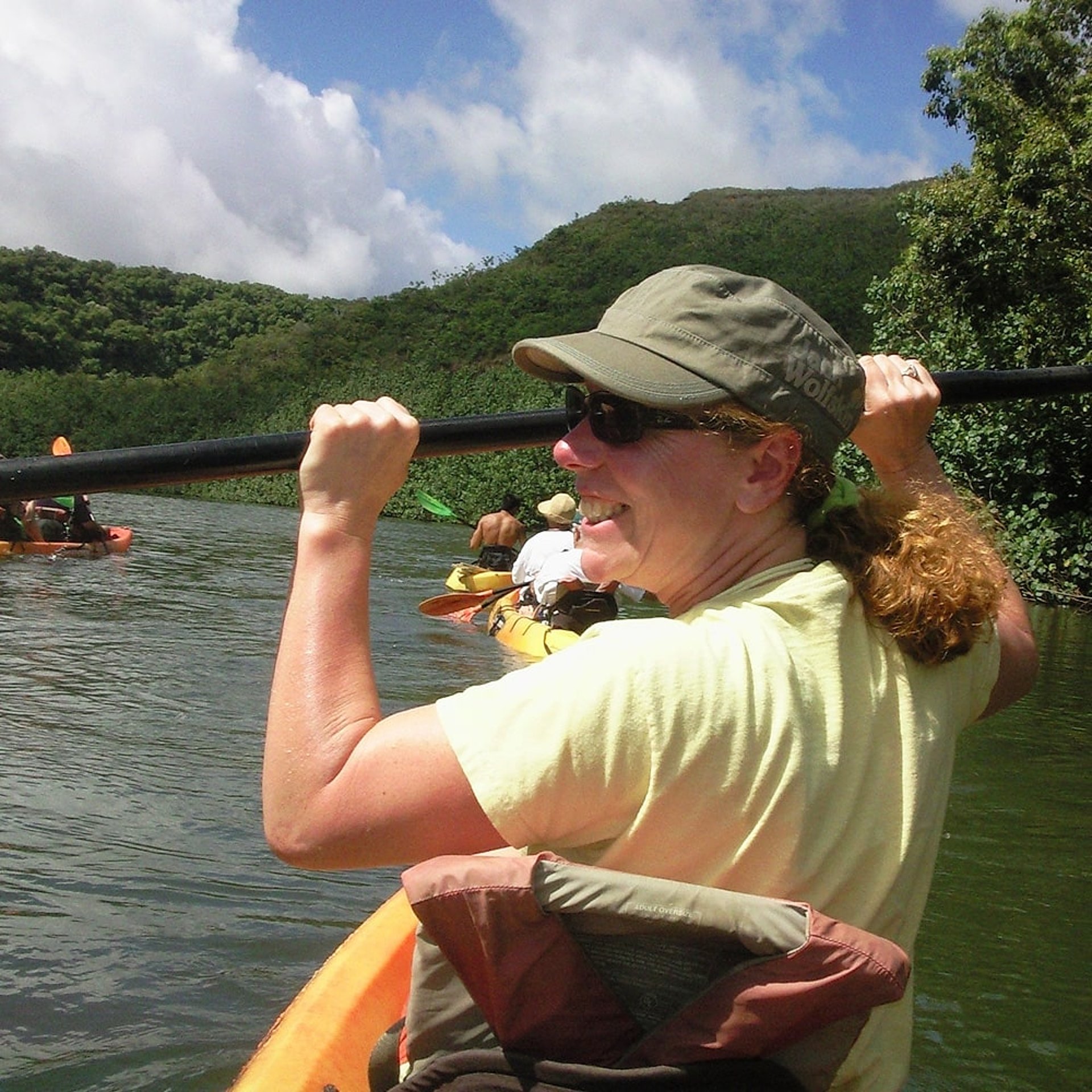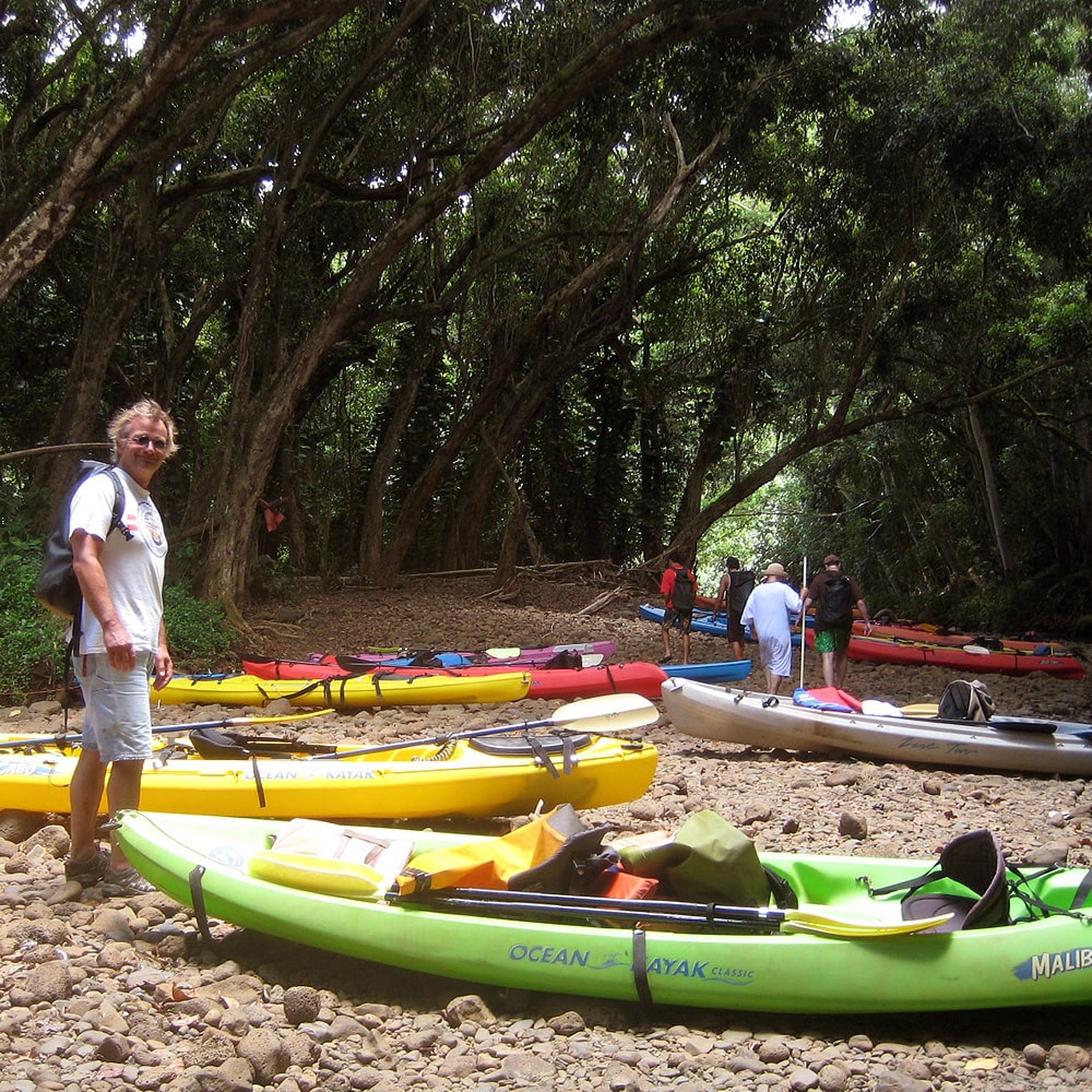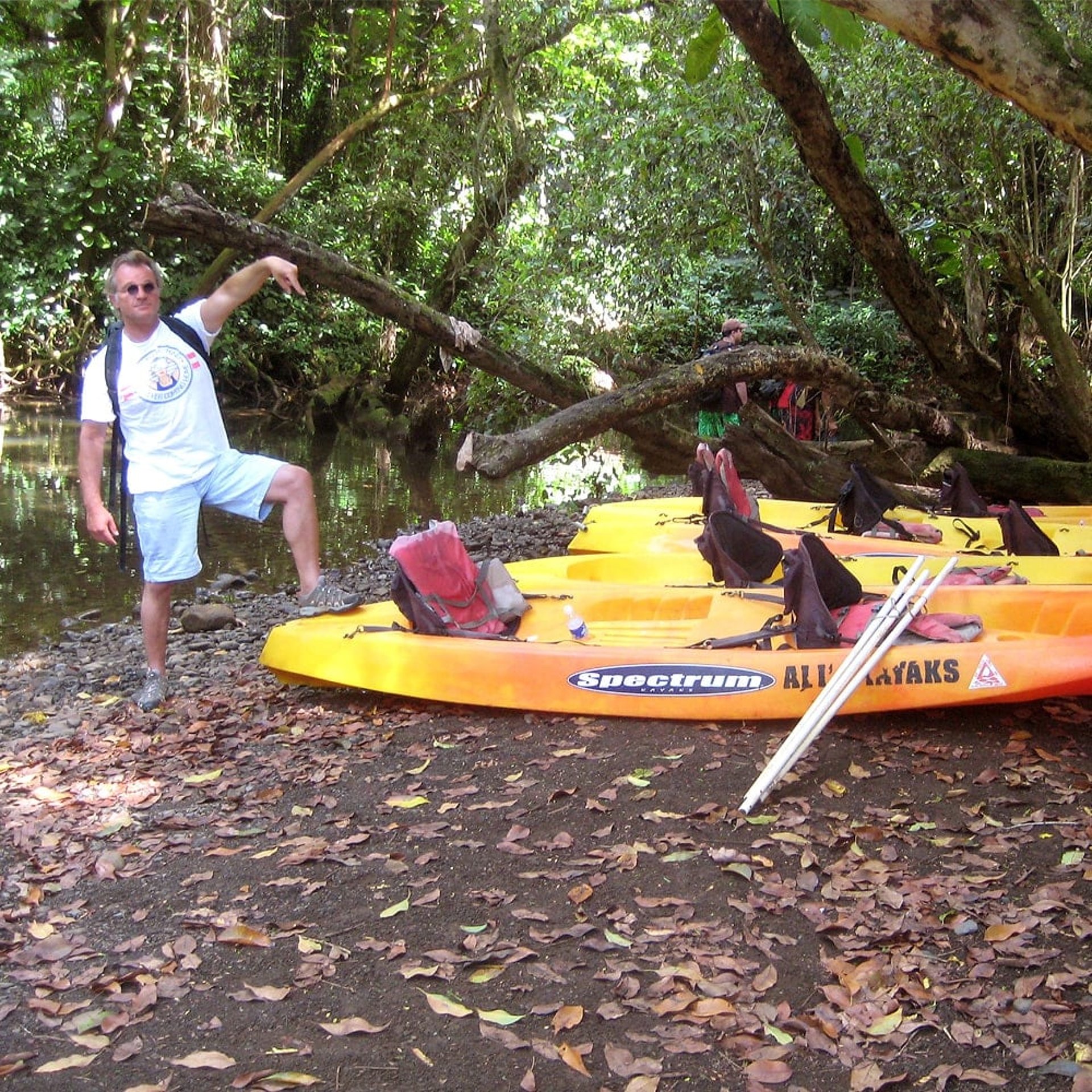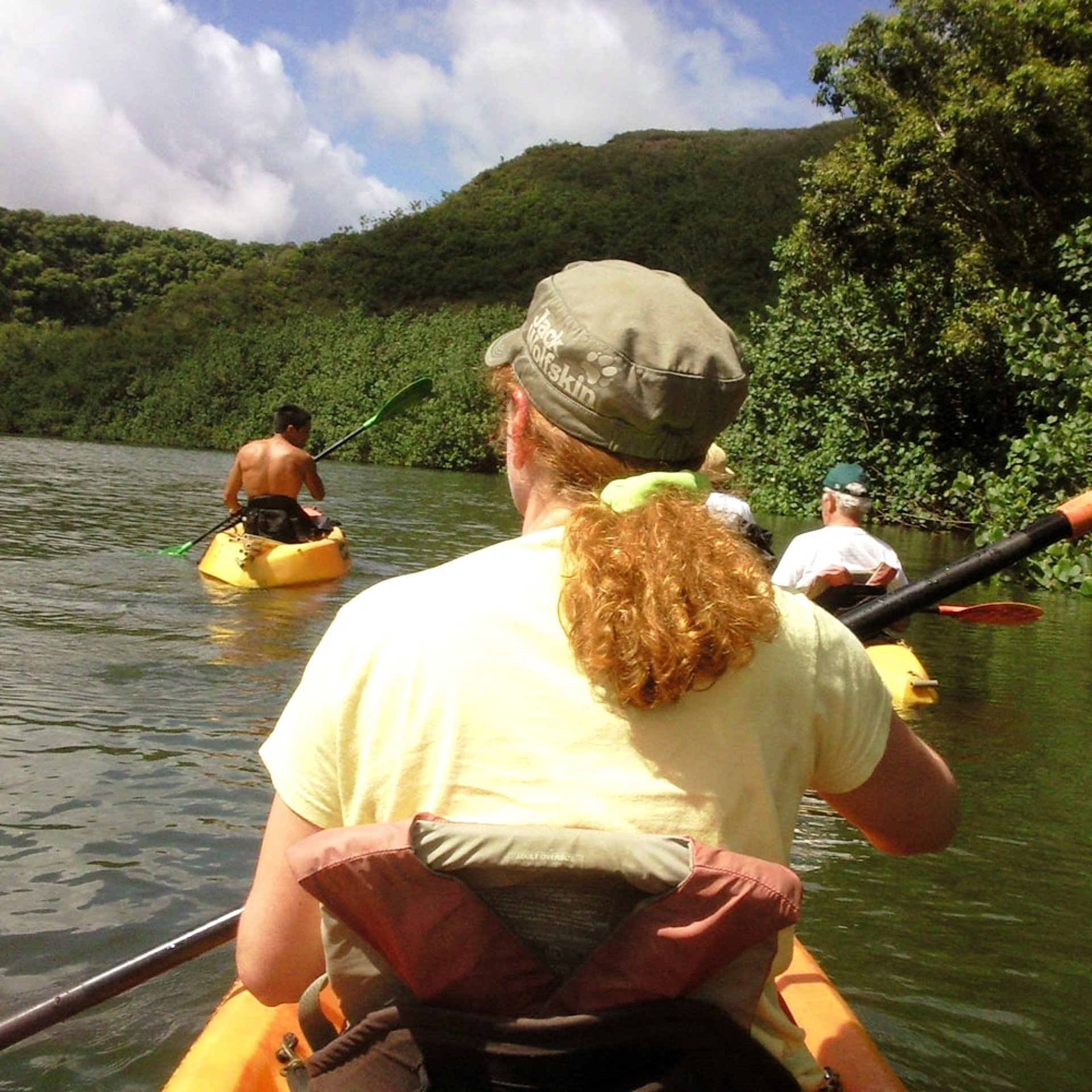 Wir sind jetzt auf ein etwas kleineres Boot umgestiegen – auf ein Kayak. Mit einer kleinen netten Gruppe sind wir auf dem Wailua River zum Secret Fall gekayakt (sagt man das so?). Na ja… so „secret“ war der Wasserfall nicht ganz. Denn es waren doch schon eine Menge Leute dort. Aber die Tour war im Ganzen großartig.