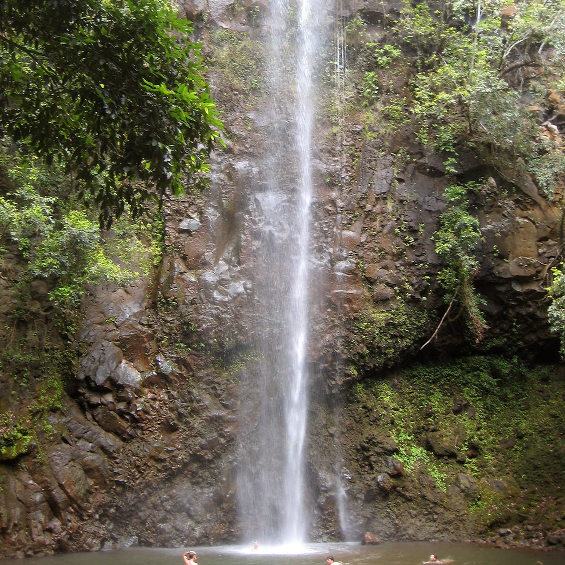 Nathan habe ich auch von meinem Erlebnis mit dem Shave Eis erzählt. Konnte er nicht verstehen, denn seiner Meinung nach ist es das beste Eis, dass hier zu kriegen ist. Seine Freundin lebt auf Oahu und die könnte das immer da essen gehen. Ich habe ihm dann versucht zu erklären, was wir hier unter Eis verstehen – aber da verzog er nur angewidert sein Gesicht. Witzigerweise waren noch zwei Italiener in der Truppe. Und wir waren da eher einer Meinung, was Eis angeht. Einer von Ihnen hatte an dem Tag Geburtstag und wir haben Luca dann am Wasserfall noch ein Ständchen gebracht. Nathan hatte seine Ukulele dabei und hat zwar noch versucht die „happy Birthday“-Melody bis zum Wasserfall zu lernen, hat aber leider nicht funktioniert.