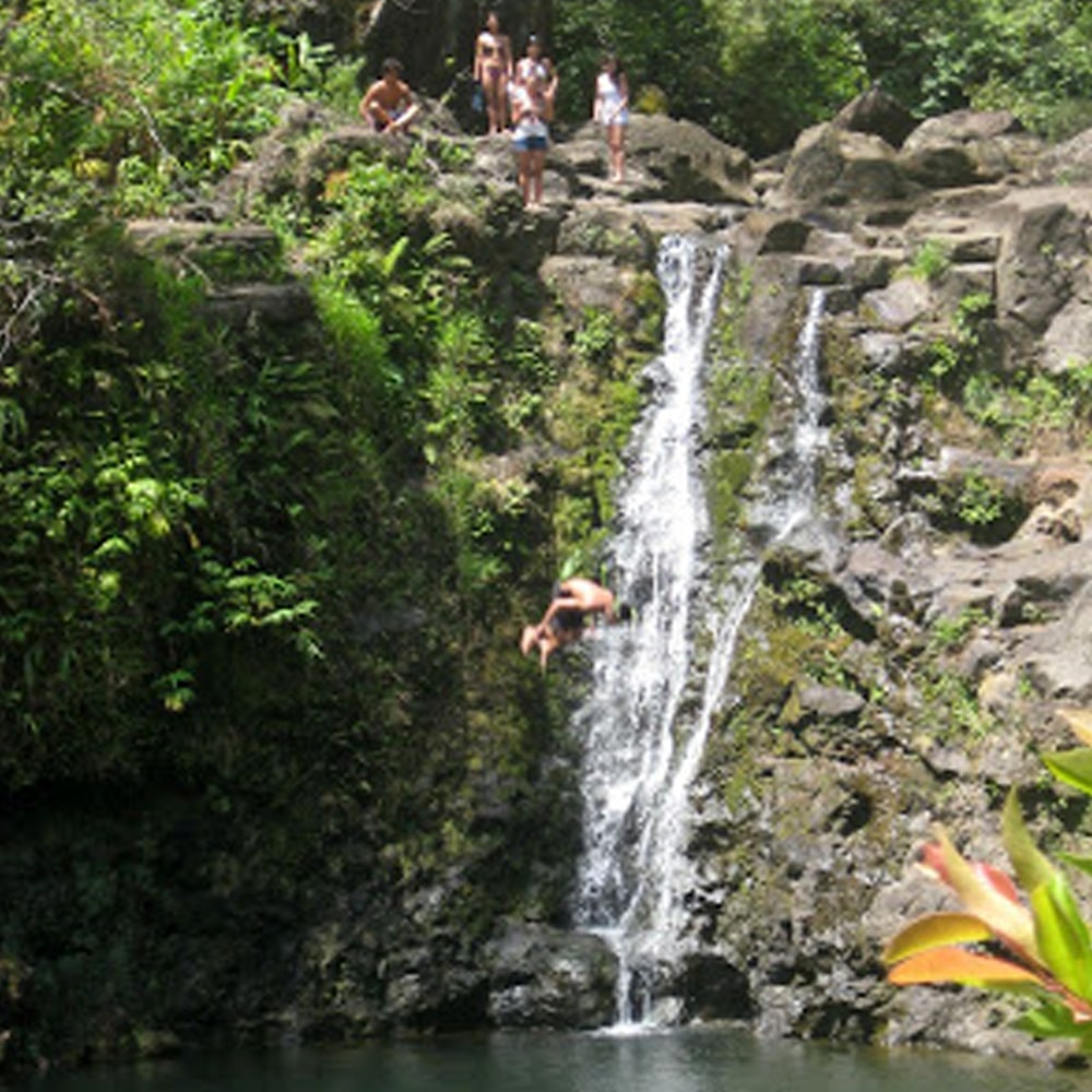 Diese Woche haben wir uns nach Hana gewagt. Hana liegt ganz im Osten von Maui und ist nur über den Highway 360 mit über 617 Kurven und 57 einspurigen Brücken erreichbar. Es geht durch dichten Regenwald (hier wurden diverse Szenen aus Jurassic Park gedreht) und wenn die Straße weiter nach oben führt, kann es auch mal heftig regnen im Paradies. Und so kommt es auch zu den vielen Wasserfällen, an denen man zwangsläufig vorbeimuss. Hier haben die Jungs ihren Spaß, wenn sie sich vor den Augen der aufgeregten Mädels mutig von den Klippen stürzen und mit einem lauten PLATSCH im eiskalten Wasser landen. Mit -vom vielen Lenkradkurbeln- müden Armen kommt man dann in diesem kleinen Städtchen mit knapp 2.000 Einwohnern an. Hana ist durch seine schwer erreichbare Lage geschützt vor Hotelburgen und Fast Food Restaurants und so sollte es auch bleiben.