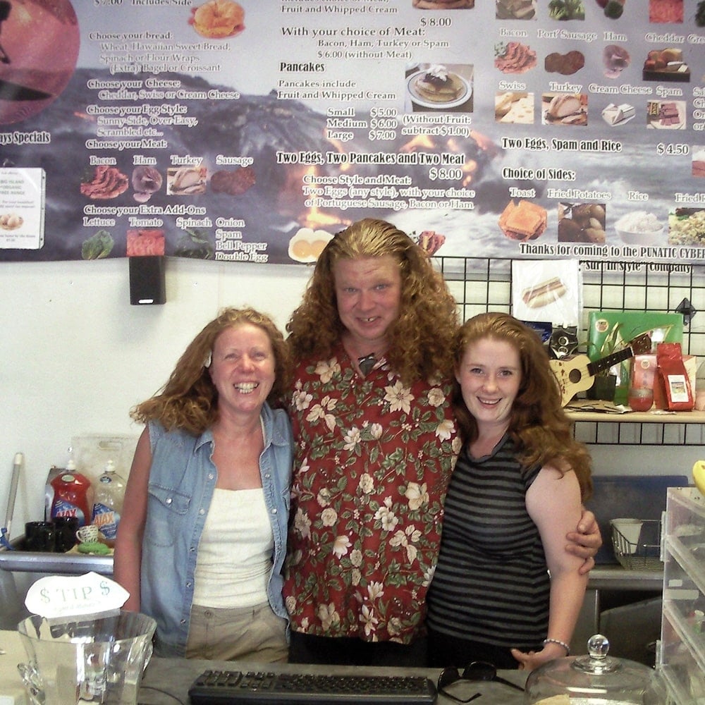 Uuuund er hatte Recht: Hippies aller Altersklassen – total nette und völlig coole Leute. Aber das Beste war das Punatics Cyber Cafe von Ernest und Crystal. Nicht nur, dass es hier den besten Coconut Pie und Mohn Muffin gibt – hier gibt es einfach alles was man in einem Laden unterbringen kann. Hier gibt’s Bücher, Klamotten, wie gesagt Kuchen, Frühstück und so ganz nebenbei erstklassige Livemusik. I like to say ALOHA to Ernest and Crystal. We really enjoyed the time at PUNATICS. Its absolutely cool and we had a great afternoon at the beach. So, Ernest if you like to show Germany to Crystal – send us an email and Tilo and I really like to invite you to stay with us.