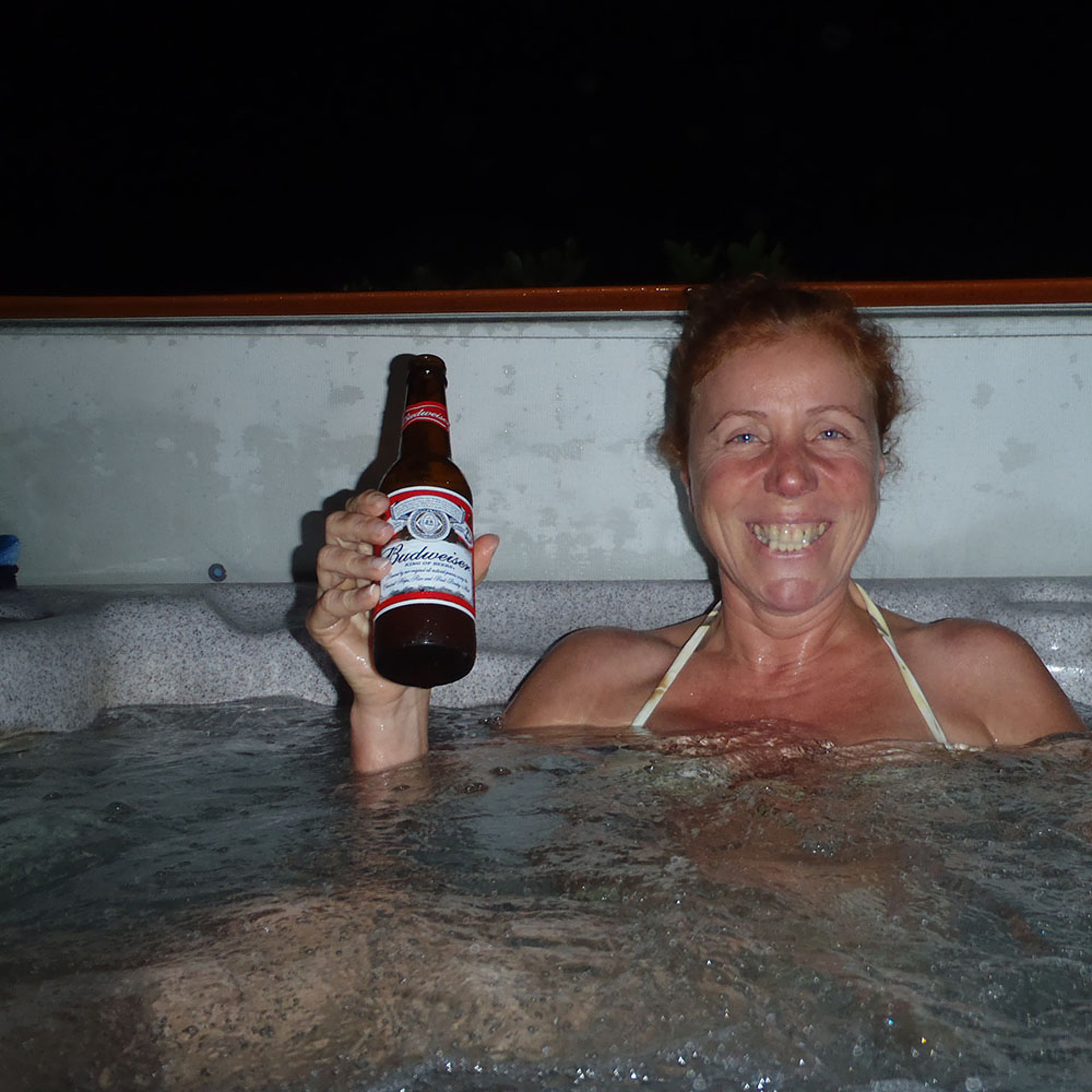 Nachdem der Tag soooo anstrengend war, haben wir ihn gemütlich bei einem lecker kalten Bierchen (leider kein Kölsch) im Jacuzzi ausklingen lassen. Das Leben kann soooo schön sein.