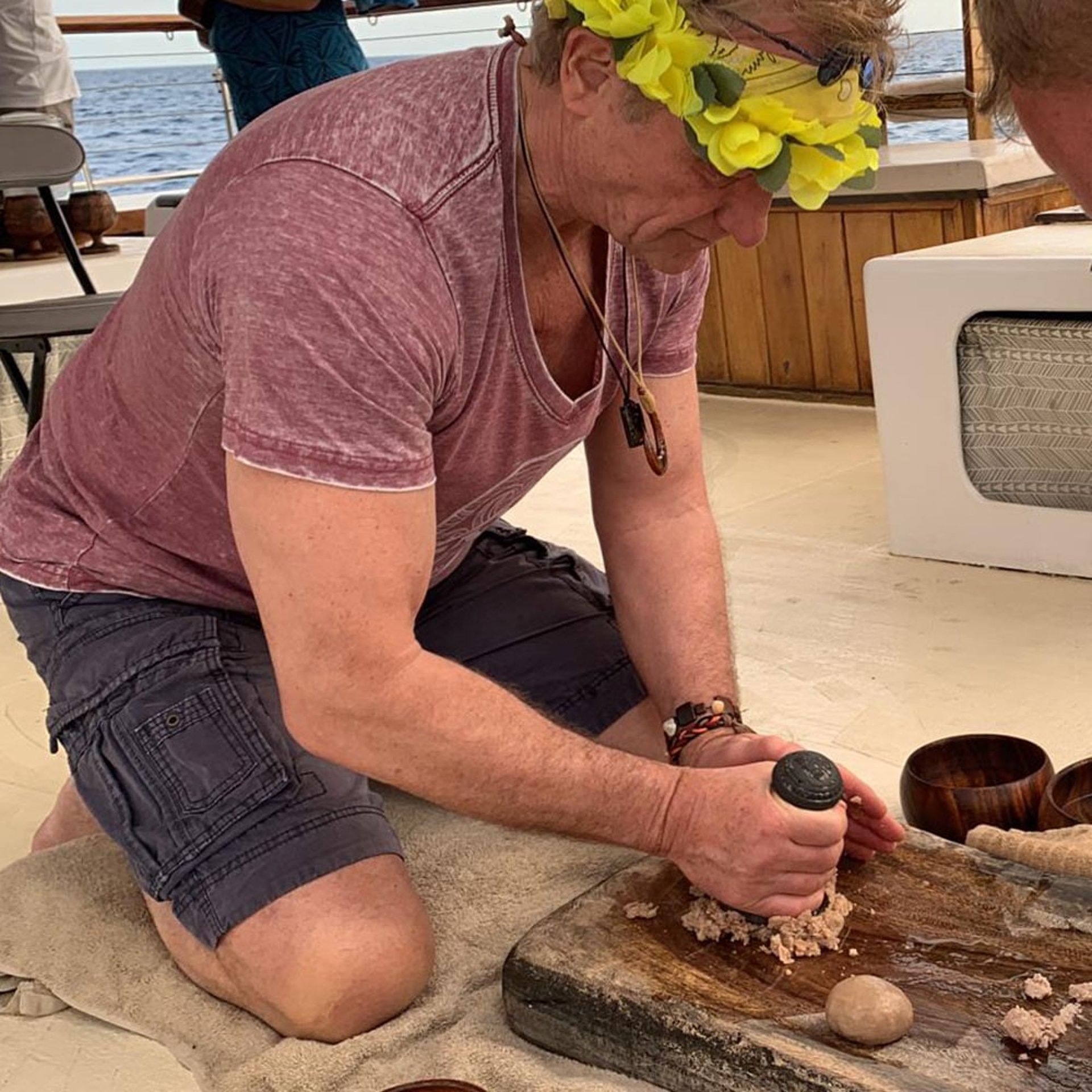 Tilo hat sich wie gewohnt um das Abendessen gekümmert und hat die hawaiianische Beilage Poi aus der Knolle gestampft… Zum Glück gab es noch Fisch, Hühnchen, Obst und Kokosnuss. Wir sind alle ziemlich satt geworden.