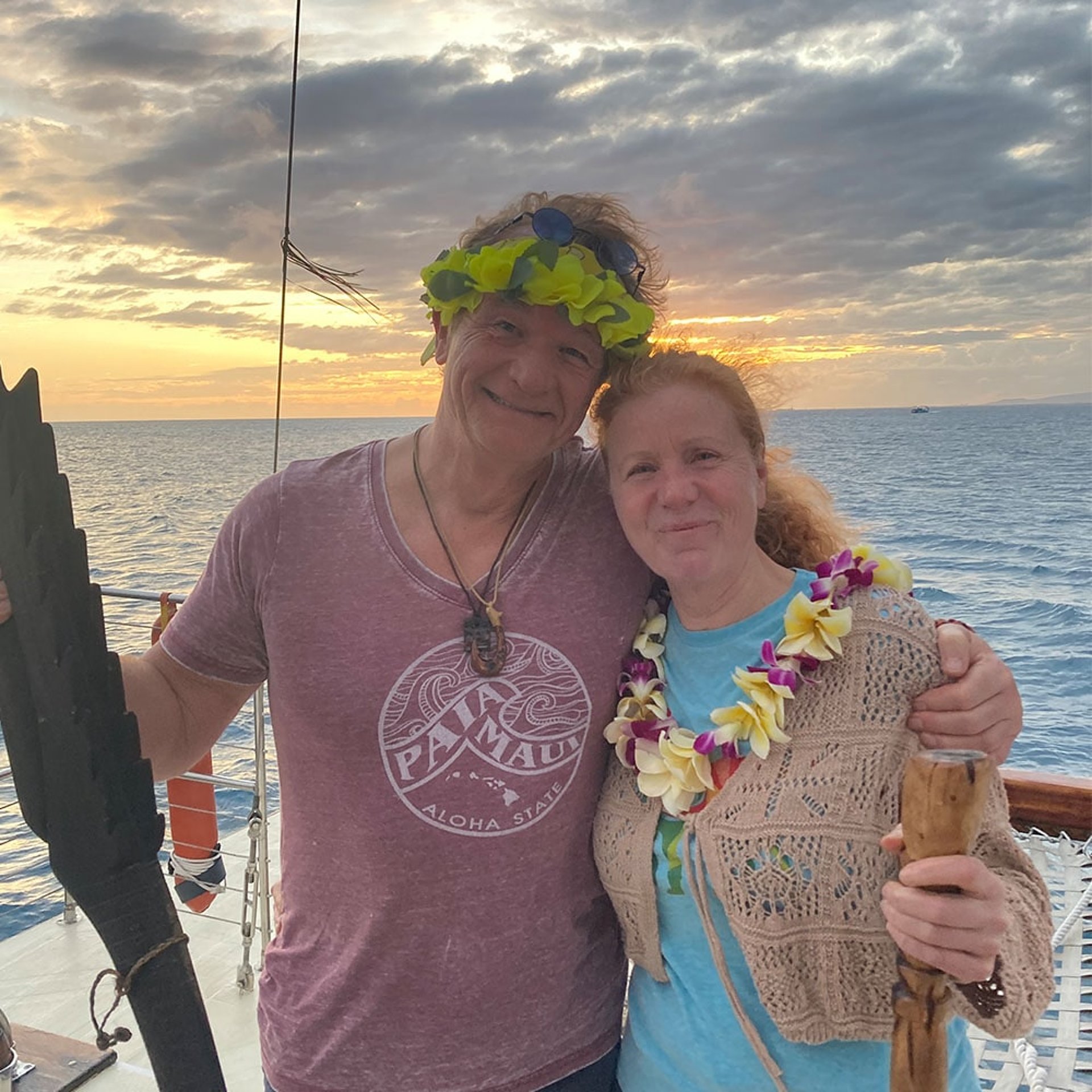 Da hat uns Danny abgeholt, der uns wieder mal mit schönen Lei begrüßt hat. Es gab viel zu erzählen und Danny hatte die gute Idee noch am selben Tag einen Sunset Sail auf dem wunderschönen Kanu eines Freundes von ihm zu buchen.